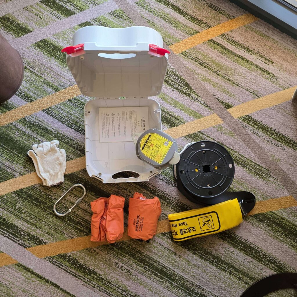 DLLs are stored in a marked container near windows, balconies, or rooftops. Inside, you’ll find the main unit—which includes the spool, regulator, and strap—plus a separate hook. Before use, attach the regulator securely to its support point (indicated with small red sign), which could be a fixed hook or a swivel arm. Then lower the spool outside, making sure the area below is clear. To put it on, slip the strap under your arms, tighten it until it’s snug, and then start your descent. As you go down, keep your hands (not your feet) pressed against the wall to avoid collisions.