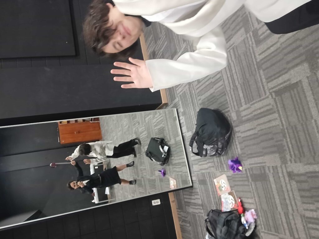 The real kicker came on the Friday and weekend before performance week, when we had a 12‑hour tech rehearsal. It was absolutely boring for the actors and stage crew, but nevertheless necessary for setting suspense in the show. The makeup was done by Mrs. Hagen, Soojin Kim ’29, and some of our cast members; hair was done by Ms. O’Leary; and the costumes were provided by Ms. Barbara Jang. Together, they captured our characters perfectly and helped us fully step into our roles.